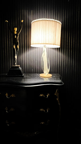 Lighting plays a pivotal role in shaping the noir mood. The 1960’s Murano table lamp, finished with a custom shade, acts as both functional light and sculptural object. Its hand-blown glass carries a sense of craft and individuality, while its warm glow softens the depth of the walls.