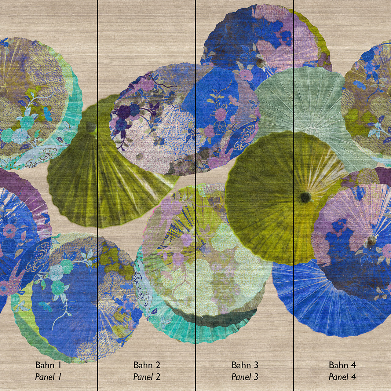 "Janome" reflects the delicate beauty and symbolism of Japanese parasols. The name "Janome," which translates to "snake's eye," describes the characteristic circular design of traditional parasols, representing protection, harmony, and balance. With vibrant colors like turquoise, green, and orange, and delicate floral accents, this wall art lends a warm and lively atmosphere to any room.