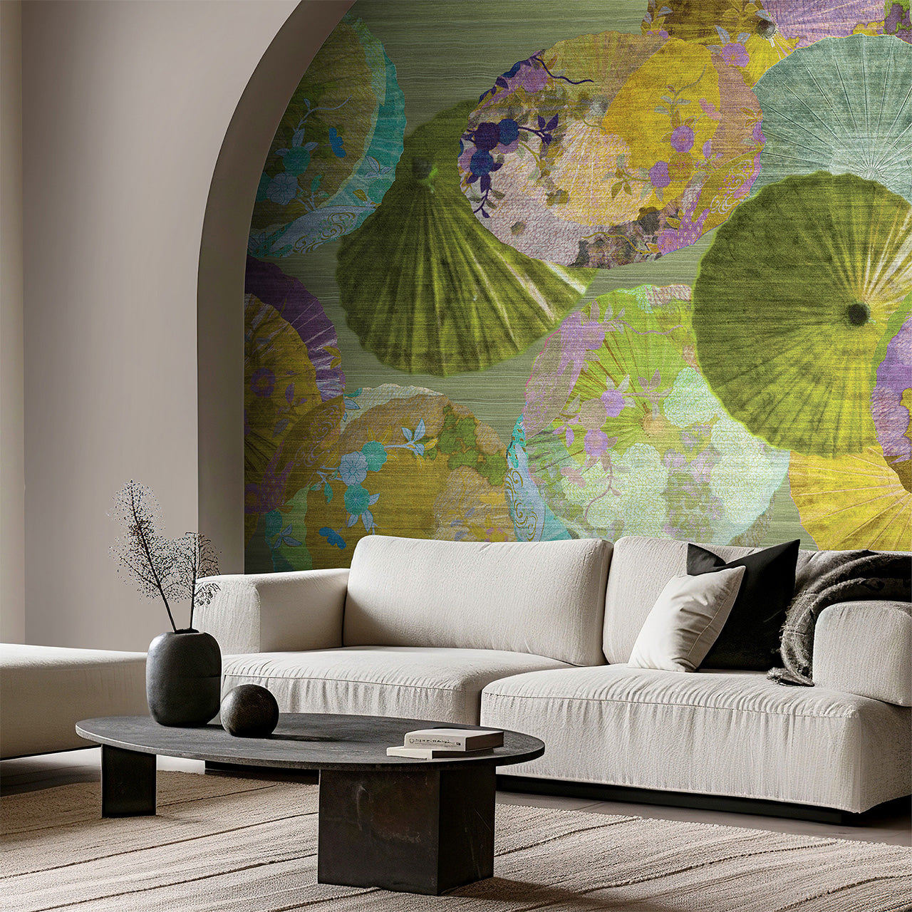 Bring the artistic and vibrant aesthetic of traditional Japanese umbrellas into your home with the "Janome" wall mural. The inspiring combination of harmonious colors, floral patterns, and geometric shapes makes "Janome" a true highlight, adding elegance and character to your space. Measuring 2.80 m wide and 3 m high, or available in custom sizes, this wall mural is the perfect choice for stylish wall decor.