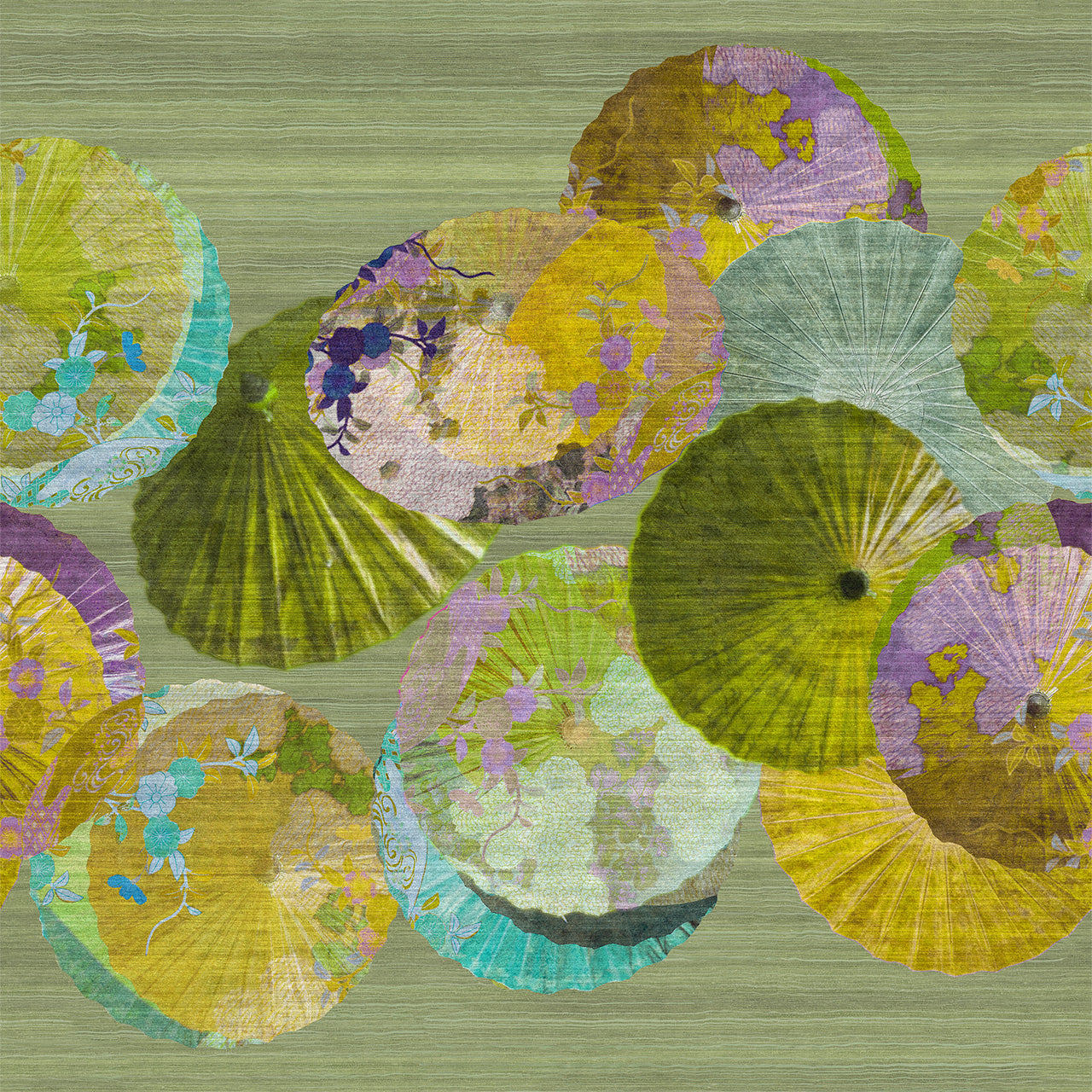 "Janome" reflects the delicate beauty and symbolism of Japanese parasols. The name "Janome," which translates to "snake's eye," describes the characteristic circular design of traditional parasols, representing protection, harmony, and balance. With vibrant colors like turquoise, green, and orange, and delicate floral accents, this wall art lends a warm and lively atmosphere to any room.