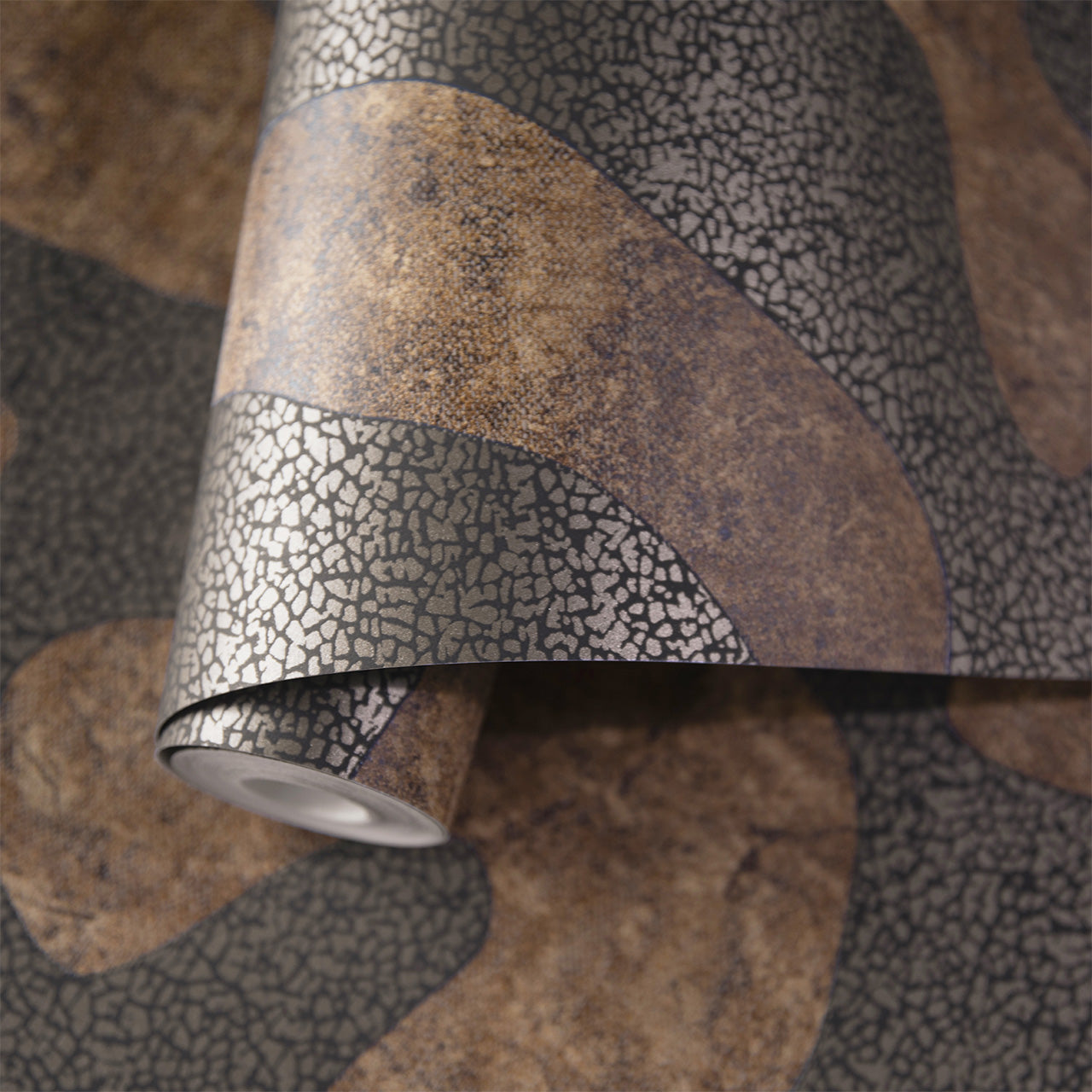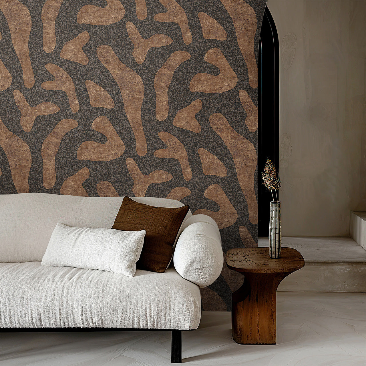 Inspired by natural contours and earthy textures, the "Elifet" wallpaper features abstract, flowing forms. The soft lines and harmonious design lend the room a sense of calm and a modern, artistic touch.